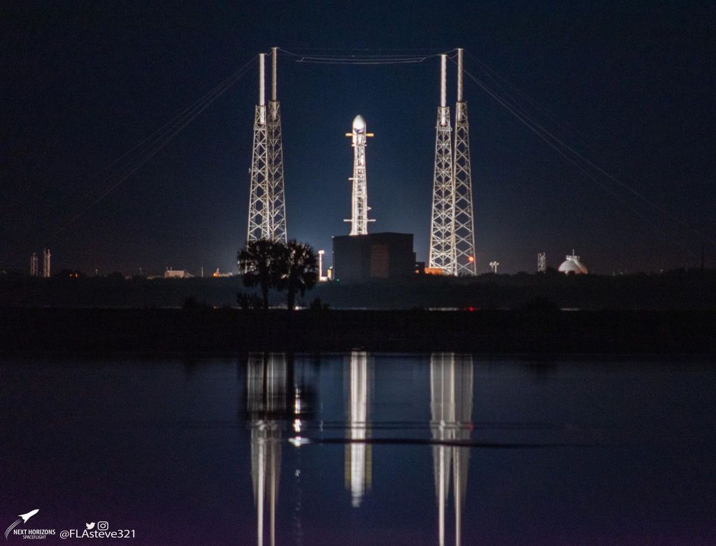 Falcon 9 and Starlink 2 illuminated on the pad. (Image credit: Next Horizons Spaceflight/Steven Keagle)