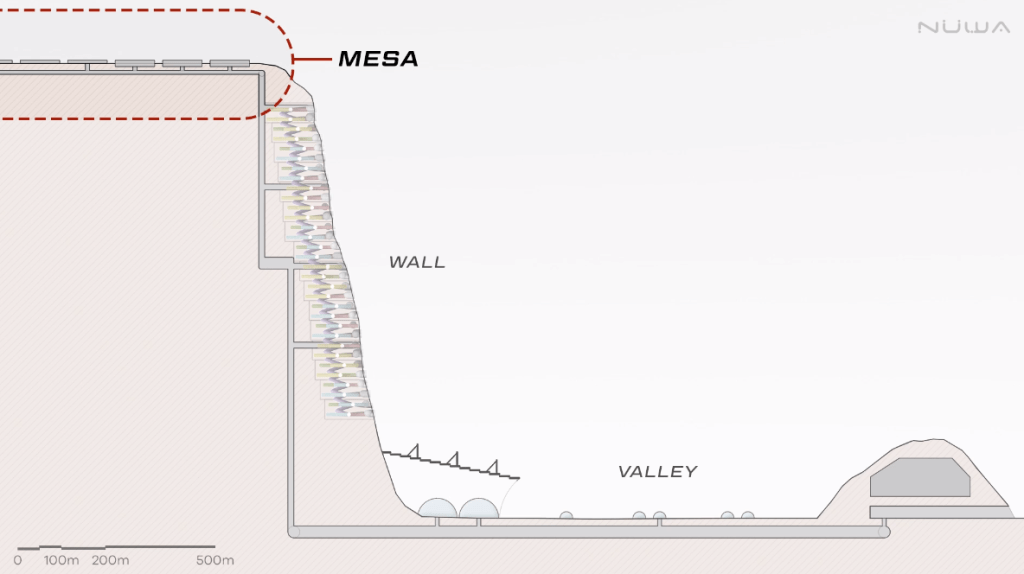 The Mesa area will consist of a field of photoelectric and solar concentrator arrays by which the city will convert sunlight into energy. There will also be power available through the use of a nuclear plant a safe distance away from the cities. The Mesa area will also consist of the domes used to house the food production greenhouses. These will be atmospherically separated from the rest of the city as most plant species benefit from higher CO2 concentrations. All work in this area will be accomplished tele robotically or by advanced AI controlled robots.