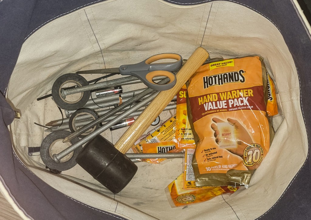 I use a large canvas tote to carry everything I need to set my remotes, stakes, hand warmers, scissors, tape, and a mallet are the main things I need in my remote bag. In addition to carrying my supplies to set, I usually put either some of my boxes or cameras/tripods in the bag too. Most times I will bring two remotes out of my car to set at a time before going back to my car to grab additional remotes.