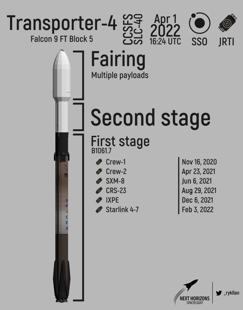 It may be April first, but there’s no joke here, surrounded by severe thunderstorms for the last several days SpaceX launched another rocket, this one carrying forty satellites on board. Transporter-4 is the first of six possible missions planned for April. Axiom-1 will follow just a few days from now, then Starlink 4-14 currently planned for the thirteenth. NROL-85 will launch a top secret payload from Vandenberg Space Force Base in California and the Crew-4 mission to send astronauts to the ISS (International Space Station) is targeting April 19th. There’s also the possibility of the Nilesat 301 mission to end things off, which if all take place will be the most launches the company has ever made in a single month.