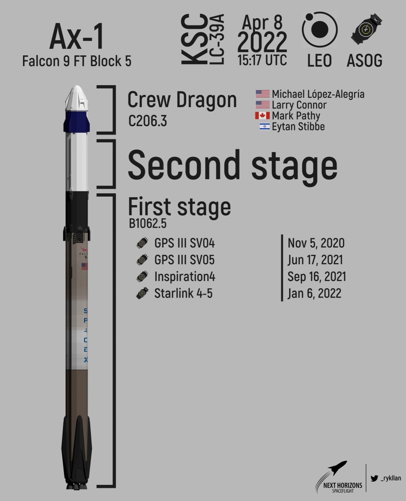 Falcon 9 B1062 will fly northeast from Florida’s space coast to line up with the space station’s orbital track. Once the first stage booster separates from the crew capsule it will begin its descent back down to Earth were it’ll land on the SpaceX drone ship A Shortfall of Gravitas positioned 500km downrange in the Atlantic Ocean. This mission is the first private mission to the ISS along with a few other historic facts for those of us keeping up with Space history. It will be the first ever third launch of a Dragon2, the 147th flight of a Falcon 9 rocket, 87th with a flight proven booster, twelve of those now happening in 2022. Today also marked the thirty-ninth consecutive landing for the company and the forty-sixth mission they’ve launched from LC-39A.